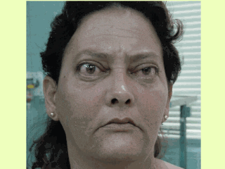 | This picture shows a case classified as mild. She has exophthalmos of both eyes. It was more pronounced in right eye (RE) and had a 2 mm superior and inferior eyelid retraction. She also had an enlargement of all the extraocular muscles of both eyes, except the lateral rectum. |