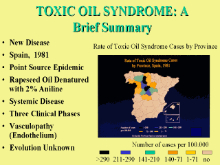 contrary no other natural clusters were encountered. The course of the disease did not improve with antibiotic administration and its geographic occurrence was found to be more frequent in a particular route. A month and half after the first case was reported it was officially announced that an industrial and fraudulent oil sold as edible oil was the vehicle of this illness. In 1983 the WHO considered this entity as a new disease that came to be called Toxic Oil Syndrome (TOS) Grandjean P, Tarkowsky S. Review of investigations and findings. In: World Health Organization, editor. Toxic Oil Syndrome: Mass food poisoning in Spain. 1 ed. Copenhagen: World Health Organization, Regional Office for Europe; 1984. p 3-16. Tabuenca JM. Toxic-allergic syndrome caused by ingestion of rapeseed oil denatured with aniline. Lancet 1981;2(8246):567-8. |
