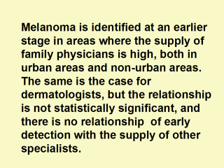 | Source: Roetzheim RG, Pal N, Van Durme DJ, Wathington D, Ferrante JM, Gonzalez EC et al. Increasing supplies of dermatologists and family physicians are associated with earlier stage of melanoma detection. J Am Acad Dermatol 2000; 43(2 Pt 1):211-218. |