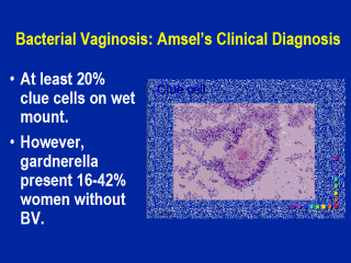 diagnosis using amsel criteria but significantly decreases the sensitivity. 2. Clue cells: squamous epithelial cells covered primarily with gardnerella which then take on this fuzzy appearance called "clue cell" as seen on wet mount of vaginal fluid. However, gardernellas can be cultured from up to 50% of normal women 9hay 1998). Therefore its presence does not therefore indicate that a woman has BV. 3. Finding of mobiluncus on microscopic exam is highly suggestive of BV. 4. Although amsel criteria is the most commonly used method to identify BV in clinical practice, there are difficulties with the individual parameters (see next slide). |