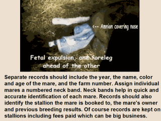 A form for recording foals Check List for Foals Dam's name ____________________ Sire _____________________ Date of last vaccinations for mare: influenza ________ rhinopneumonitis ________ tetanus ________ encephalomyelitis ________ distemper ________ rabies _________ wax formation: early ________ late ________ none ________ colostral loss? ____ date mare foaled __ time of foaling ________ ease of foaling: no assistance ________ slight traction ________ moderate traction ________ severe dystocia ________ oxygen necessary? ____ time & manner of umbilical separation ___________ iodine navel _______ placental expulsion: time ____ weight ________ condition ___________________________________________ attitude of foal _______________________ first stood ____________ blood/colostrum agglutination: none ___ slight ___ moderate ___ first nursed: _______ meconium passed: _______ urinated: _______ tetanus antitoxin adminstered to foal ___________ enema necessary? _____ antibiotic administered to: dam _____________ foal ____________ weight of foal __________ color of foal __________ sex __________ markings drawn on application? ______ photograph? ______ check foal's vital signs at 4, 12 and 24 hours postpartum: 4 hour vitals: heart ______ respiration ______ temp ______ 12 hour vitals: heart ______ respiration ______ temp ______ 24 hour vitals: heart ______ respiration ______ temp ______ |