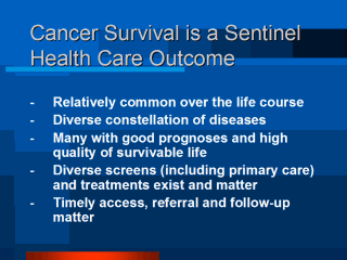 | Cancer care outcomes then, particularly among the most public health-significant cancers such as breast and colon cancer, can be thought of as sentinel indicators of a health care system’s effectiveness. |