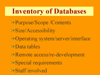 prosecutions register). To map the efficiencies to be gained, data custodians and business managers need to be asked about purpose of the database, the scope and contents by data fields, the current size, access rights by various users, platforms, software, data tables used of possible interest to others within Public Health, whether remote access is required and whether redevelopment was being considered or was underway. Finally, additional information on any special requirements for the future and the number and type of staff involved in its operation. Do not forget to include questions on potential business benefits of integrating with other databases, and potential barriers. |