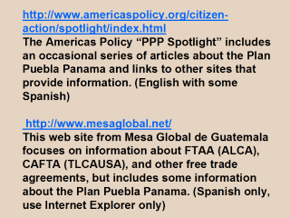 http://www.interaction.org/idb/ppp.html The homepage for the Plan Puebla Panama section of InterAction’s IDB-Civil Society Initiative. Has links to excellent information and some good maps. (English with some Spanish) http://www.interaction.org/files.cgi/1946_graficosppp1.600.pdfThese maps, developed by InterAction in 2001, show some of the key projects that are planned as part of the PPP. http:www.nafta-sec-alena.org%2F NAFTA, North American Free Trade Agreement, and the prospects of New World free trade. NAFTA for Canada, USA & Mexico has been in effect for 10 years. http:// www.iadb.org/pppInter-American Development Bank CAFA, CARICOM, MERCOSUR, Group of Three (Mexico, Colombia, Venezuela) and the Andean Group can also be found on the Web along with the Organization of the American States, International Monetary Fund, World Trade Organization, General Agreement on Trade in Services, Multilateral Agreement on Investment and the Organization for Economic Cooperation and Development (OECD). |