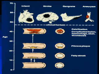 | This is an old slide suggesting that fatty streaks only begin in the second decade, based on information from Korean soldiers. We know now from the PDAY study and more recent information that this whole process is accelerated such that fatty streaks are now sometimes seen in infancy and certainly before the age of 5 years, with atherosclerotic disease by the twenties and thirties. |