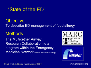 study to describe the management of food allergy in the ED. EMNet is a network of over 160 EDs focusing on research of asthma, anaphylaxis, and other airway disorders. |