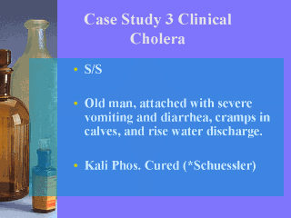 upon in cholera. For prevention Nat Sulph is called upon due to its property of removing water molecules from the body, as the primary cause of cholera is the over supply of water in the blood. This in term causes a great disturbance in the grey matter of the brain thus the administration of Kali Phos. (taken part from Dr. Carey.) |