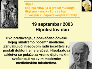 Kratka Hipokratova biografija Hipokrat (460-377? p.n.e.) je bio izuzetni grčki medicinski pisac. O njegovom životu zna se malo, osim da je bio lekar na ostrvu Kosu, da je pripadao najintelektualnijem periodu grčkoga života, i da nije bio sujeveran. Pripisuje mu se preko osamdeset rasprava, ali danas se smatra da su neke od njih napisali drugi koji su pozajmili njegovo ime i ugled. Njegova sabrana dela čine deset svezaka, enciklopediju medicine i hirurgije, kako se nazivala u njegovo vreme. Hipokrat je nazvan ocem medicine. Nije verovao u čudesne bolesti niti izlečenja. Govorio je da je pravilna ishrana neophodna za zdravlje, i da klima ima veliki uticaj i na telo i na duh. Umro je u Tesaliji u dubokoj starosti. http://www.sacklunch.net/biography/H/Hipokrat.html U Grčkoj se 19. septembar slavi kao Hipokratov dan. Predlažemo da se Hipokratov dan slavi u celom svetu kao proslava prevencije, Svetski dan prevencije, kada ćemo zajedno raditi na prevenciji bolesti. Dana 19. septembra 2003. želimo da "venčamo" Hipokratove medicinske koncepte i preventivne koncepte Higije, grčke boginje zdravlja. HIGIJA je bila boginja dobrog zdravlja i pratilac svog oca Asklepija, a takođe i Afrodite koja je predstavljala prevenciju bolesti. "Zajednica" Hipokrata i Higije može, takođe, predstavljatii dva oblika energije, Yan &Yin. Za dodatne informacije o Hipokratu posetite: http://www.allsis.com/Science/Hipokratbiog_rtb_gn.htm Ovaj slajd napravio je tim Globalne zdravstvene mreže Superkursa |