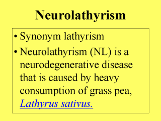 Related terminologySimilar pathological changes can be produced in the bone (Osteolathyrism) and blood vessels (Angiolathyrism). Osteolathyrism can be observed among few neurolathyrism patients whereas angiolathyrism was only observed in experimental animals. |