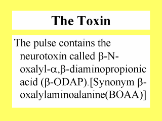 | The toxin bring neuronal damage commonly to the motor cells of the thoracic and lumbar spinal nerves through its excitatoxic action on the glutamate receptors. Symmetrical axonal degeneration of both crossed and uncrossed pyramidal tracts in the spinal cord is the principal pathological change observed. |