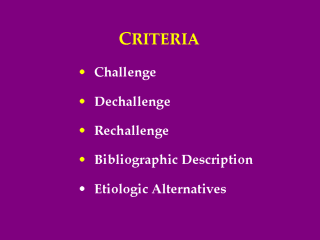 | Decisional Algorithms are all supported by the combination of five common major criteria for causality assessment: challenge, dechallenge, rechallenge, previous bibliographic description and etiologic alternatives, as simple definitions, questionnaires, decisional tables and dichotomic trees. |
