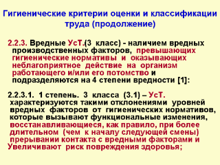 2.2.3.2. 2 степень. 3 класса (3.2) - уровни вредных факторов, вызывающие стойкие функциональные изменения, приводящие в большинстве случаев к увеличению производственно обусловленной заболеваемости, появлению начальных признаков или легких (без потери профессиональной трудоспособности) форм профессиональных заболеваний, возникающих после продолжительной экспозиции (часто после 15 и более лет); 2.2.3.3. 3 степень. 3 класса (3.3) - УсТ., характеризующиеся такими уровнями вредных факторов, воздействие которых приводит к развитию, как правило, профессиональных болезней легкой и средней степеней тяжести (с потерей профессиональной трудоспособности) в периоде трудовой деятельности, росту хронической (производственно обусловленной) патологии, включая повышенные уровни заболеваемости с временной утратой трудоспособности; 2.2.3.4. 4 степень. 3 класса (3.4) - УсТ., при которых могут возникать тяжелые формы профессиональных заболеваний (с потерей общей трудоспособности), отмечается значительный рост числа хронических заболеваний и высокие уровни заболеваемости с временной утратой трудоспособности. [1] В классификации в основном использована качественная характеристика изменений в организме работающих, которая будет дополняться количественными показателями по мере накопления необходимой информации. |