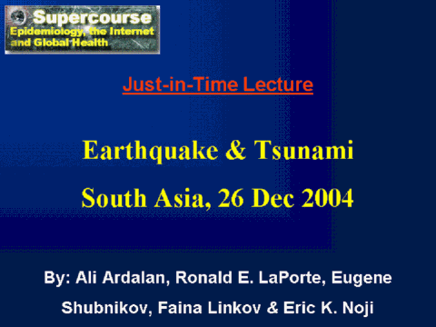 This lecture is dedicated by Global Health Disaster Network (GHDN) to the victims of 26 Dec 2004 disaster at south Asia. Please send the messages to aardalan@gmail.com . It would be great to have you involved. Authors: Ali Ardalan, MD, MPH, PH.D. student of Epidemiology Department of Epidemiology & Biostatistics School of Public Health & Institute of Public Health Research Tehran University of Medical Sciences Iran Ronald E. LaPorte, Ph.D. Director, Disease Monitoring and Telecommunications, WHO Collaborating