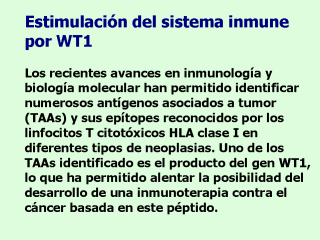 La habilidad de la proteína de WT1 para funcionar como antígeno blanco para inmunoterapia se ha examinado tanto en un modelo murino in vivo y sistemas humanos in vitro. En el sistema murino in vivo, la inmunización con el péptido de 9 bases (a.a.235-243 CMTWNQMNL) o con el cDNA de WT1 inducen la proliferación de linfocitos T citotóxicos (CTLs) específicos para WT1. En el sistema humano in vitro, la estimulación de las células sanguíneas periféricas mononucleares (PBMC) con el pétido de 9 bases para el HLA2402 o HLA-A0201 estimulan la proliferación de CTLs específicos para WT1. Estos resultados demuestran que la proteína de WT1 puede ser un antígeno utilizado para le inmunoterapia en cáncer. En base a estos resultados, se empezó a aplicar inmunoterapia en estudios clínicos.