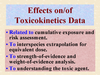 metabolites in the body. As mentioned in Slide 10, the U.S. Food Quality Protection Act (FQPA) mandates that EPA and FDA consider aggregate and cumulative exposures in their health risk assessment. Cumulative risk or exposure assessment is that process in which an accumulation is made on exposures to multiple chemicals that cause the same toxic effects by a common mechanism. The common toxic effects caused by these multiple chemicals are likely investigated in different species or not following the same dosing regime. In that case, the doses used in animal studies should be extrapolated to human doses through PB-PK modeling. This approach for dose extrapolation between species or routes of exposure is not feasible, however, unless extensive comparative metabolism and PK data are available. Toxicokinetics data are also crucial in understanding the extent of biologic interactions by which chemicals exert their toxic effects on living organisms. Without this type of information, the strength-of-evidence and the weight-of-evidence analyses cannot be performed in hazard identification or dose-response assessment. As pointed out by Scala (1991), an understanding of how a toxic agent functions “will help to determine whether the health of the public requires excessively conservative risk models or not.” |