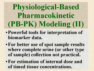 human exposure and health risk assessment. Despite its popularity in biomonitoring, urine analysis is not a test without limitations. Routine collection of 24-hour samples in human subjects is usually impractical. Urine analyses for exposure monitoring purposes are accordingly often necessarily conducted on spot specimens. One approach to a more effective interpretation of biomarker data based on spot sample results is hence to simulate the internal dose through use of a PB-PK model (Dong et al., 1996). Known physiological and biochemical parameters are used in PB-PK simulation. Thus, another advantage is that a different species can be simulated with the model on hand by replacing the appropriate physiological and PK constants, which can be derived from allometric and related equations. |