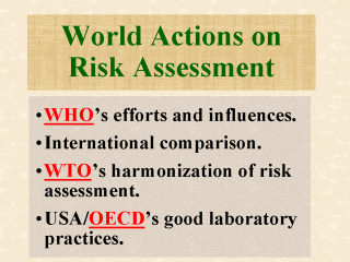 chemicals based on data available in the literature. A few years back, Moolenaar (1994) had made an international comparison of the methodologies used by several countries for regulatory assessment of cancer risk, partly in response to the international efforts made then to harmonize RA. In addition to the Organization for Economic Cooperation and Development (OECD), other world organizations like the World Trade Organization (WTO) and the United Nations Conference (on the Environment in Rio de Janeiro in 1992) were very active in this harmonization movement. Both USA and OECD have provided regulations and standards governing good laboratory practices (GLP) which cover all phases of toxicity testing, such as animal care, data gathering, laboratory analysis, and sample preparation. GLP are relevant to RA in that the strength-of-evidence and the weight-of-evidence analyses are central to toxicity assessment. |