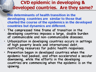 The epidemiologic transition in Asia is very different from the classic transition that occurred in the West. First, the transition in the West was essentially reciprocal--communicable diseases went down and were replaced by a rising burden of noncommunicable diseases. In the developing countries of Asia, however, there is an overlap, with countries having to face fairly significant burdens of communicable and noncommunicable disease simultaneously. Second, the transition is occurring much faster in Asia's developing countries than it did for countries in the industrialized West. One reason may be the rapid economic growth and improvements in health care infrastructure that have paralleled the shift in the causes of ill-health. The compressed time frame of transition in the developing countries imposes a large, double burden of communicable and non-communicable diseases. Unlike in the developed countries where urbanization occurred in prospering economies, urbanization in developing countries occurs in settings of high poverty levels and international debt, restricting resources for public health responses. Organized efforts at prevention began in developed countries when the epidemic had peaked, and often accelerated a secular downswing, while the efforts in the developing countries are commencing when the epidemic is on the upswing. Strategies to control CVD in the developing countries must be based on recognition of these similarities and differences. Principles of prevention must be based on the evidence gathered in developed countries, but interventions must be context-specific and resource-sensitive. |