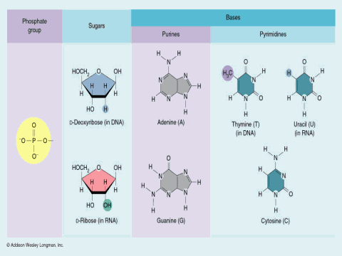 | The components of nucleotides. The three building blocks of a nucleotide are one or more phosphate groups, a sugar, and a base. The bases are categorized as purines (adenine and guanine) and pyrimidines (thymine, uracil, and cytosine). |