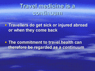 | Travelers do get ill or injured abroad or when they return home. The commitment of travel health is a continuum from before the traveler leaves to after the traveler returns home. |