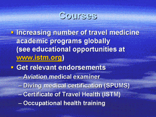 these opportunities (See http://www.istm.org). Travel health advisors may also need special training and certification in aviation medicine, diving medicine and occupational health to assist them in their travel medicine practice. |
