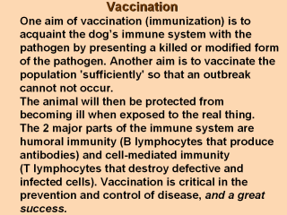 | The goal is to vaccinate at least half of the animal populations and to immunize individual animals less frequently and only for diseases for which there is a definite risk of exposure. One shot for everything is an ideal! |