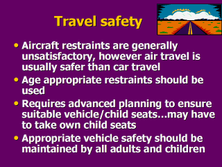 should not sleep on the floor or in the aisle ways. During take off, landing or during turbulence, very young children should be properly restrained. Standard airline seats belts are unsuitable for very young children as the child can slip underneath or out of them. This can result in severe injury, if the plane decelerates appreciably, given that planes travel at much higher speeds than motor vehicles. Planes can also experience unexpected vertical sheering, which can also result in injury to children or adults. Special children's restraining seatbelt, which anchors onto the parent's or guardian's seatbelt, are available and should be requested. It is important that the child is not placed inside a standard seatbelt with an adult, as the weight and the momentum of the adult during any deceleration or turbulence may crush the child (Neuman, 1996). Children are best held securely in the arms of a parent or guardian where no other option is available. During severe turbulence or a crash landing, the infants should be cocooned as the parent or guardian bends over in the crash position (Neuman, 1996). Neuman K. Child safety restraints during air travel. Traveling Healthy. December, 1996. |