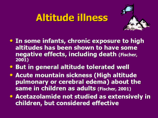 (Fischer, 2001) Acetazolamide not studied as extensively in children, but it is considered effective. Fischer PR. Traveling with children. In Zuckerman JN (Ed) Principles and Practice of Travel Medicine. 1st Ed. Chichester: John Wiley and Sons, 2001: 367-379. |