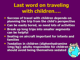 need attention from their parents or guardians. Some parents are tempted to use sedatives for their children. This should generally be discouraged. The effect of antihistamines is unpredictable. For younger children, taking a favourite blanket or pillow may assist sleep en route. If the child is sedated, it is important that the responsible adults avoid being sedated themselves. Airlines often have special meal options for children and it is worth advising the airlines well ahead of travel to request special children's meals. |