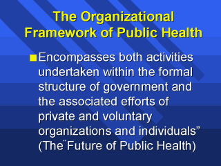 | The vision of public health included defining the organizational framework of public health. That framework encompasses both activities undertaken within the formal structure of government and the associated efforts of private and voluntary organizations and individuals. |