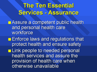 Essential Services that I believe are related to assurance are: Assure a competent public health and personal health care workforce Enforce laws and regulations that protect health and ensure safety Link people to needed personal health services and assure the provision of health care when otherwise unavailable |
