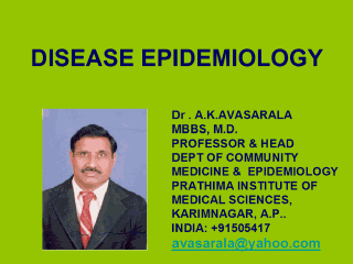 Author profile: After medical graduation, worked for 17 years in the field as primary care physician in primary health centres, area hospitals, mobile medical units, cholera combat team, filarial control project, casualty department, divisional secondary care hospitals Then completed post graduation in public health medicine/preventive & social medicine & epidemiology and teaching medical graduates and post graduates, nursing students, physiotherapy students, primary care personnel for the last 15 years. At present working as Professor & Head of the department of Community medicine & Epidemiology since 15 years and practicing and contributing to the cause of epidemiological spread and growth in India (life ambition) as Indian super course epidemiology developer. Other EIGHT super course lectures of mine can be accessed at www.pitt.edu/~super1/faculty/lecturers.htm |