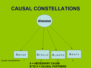 several causes form into groups or constellations to cause the disease. A necessary or principal cause will be helped and complemented by other causes (predisposing, enabling, precipitating, reinforcing causes) making it sufficient to initiate the disease. Unless a necessary cause has enough support by other causes by means of their complementing and synergistic action, that cause can never become sufficient enough for disease initiation. These causal partners will not loose their identity and individuality while complementing necessary cause but just help the necessary cause. While doing so, these causal partners form a web of cumulative and synergistic action with the necessary cause to initiate the disease. That means when a necessary cause is fully complemented with its causal partners, it becomes sufficient enough to cause the disease. Presence of a sufficient cause means that disease is initiated. This explanation is true serves for both the infectious and non-infectious disease. |