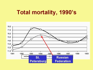| During the 1990s, mortality rose for all age groups except infants and children, and for both sexes, though the increase was far greater for males. The greatest increase in mortality was among males aged 40–49, which nearly doubled (87% increase) in the period 1990–1994 (4). |