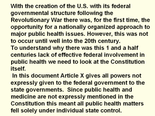 Proponents of federal government involvement in public health attempted to circumvent this Constitutional hang-up by citing other parts of this document which could be interpreted to allow federal governmental participation in public health matters i.e.: the interstate commerce clause gave the federal government the power to regulate interstate commerce (impure food and drugs) and the fact that Congress was empowered to provide "for the general welfare" of the populace would appear to give the federal government a wide range of authority in preserving the public's health. Despite these last 2 points, states rights’ proponents and all other parties opposing federal intervention, for whatever reasons, continued, and still continue today, to raise the Constitutional issue of the federal government’s legal role in public health issues.