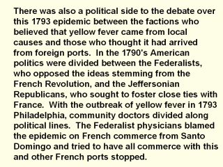 | The Jeffersonian Republicans, on the other hand, rejected this claim and blamed the disease on local causes. This division over the cause of yellow fever increased the political tensions in Philadelphia and illustrates how health issues could, and still can, get dragged into the political arena, i.e.: today’s AIDS’ crisis, tobacco, acid rain pollution. |