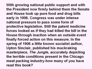 | While shooting for the heart Sinclair had hit America’s public solidly in the stomach. The sale of beef in the U. S. plummeted. Roosevelt was outraged and demanded Congressional action. While Congress did pass a separate Pure Meat Act, the pressure to pass a pure food and drug bill proved overwhelming. With Wiley and Adams as the forces behind the bill Congress finally relented and on June 30, 1906 the President signed the Pure Food and Drug Act into law. |