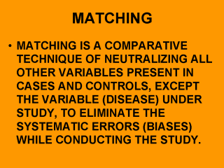 Cases are made identical with controls i.e. all the known variables of the cases like age, sex, occupation, social status etc are neutralized with those of controls except the factor (disease) under study. For example, cases and controls of same age, same sex, same occupation and living same village may be selected for better comparison, if feasible. Like should be compared with the like principle is to be followed. When every thing remains common and same for both the groups and if the cause is found excessive in the cases than in controls, then it is presumed to cause the disease in the cases. |