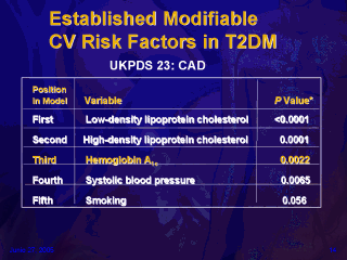 evaluated baseline risk factors for CAD in patients with T2DM.1 The study found that five potentially modifiable risk factors for CAD exist in patients with T2DM.1 The study found that the top three major risk factors were LDL cholesterol, total cholesterol, and HbA1c.1 1. Turner RC, Millns H, Neil H, et al. Risk factors for coronary artery disease in non-insulin dependent diabetes mellitus: United Kingdom Prospective Diabetes Study (UKPDS: 23). BMJ. 1998;316:823-828. |