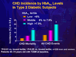 The graph looks at CHD incidence, stratified by HbA1c levels.1 The study found that subjects with an HbA1c of <6% had fewer CHD events and much lower CHD mortality, providing rationale for aggressive glucose lowering.1 1. Kuusisto J, Mykkanen L, Pyorala K, Laakso M. NIDDM and its metabolic control predict coronary heart disease in elderly subjects. Diabetes. 1994;43:960-967. |