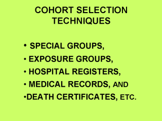 When choosing the special groups like doctors or occupation groups, special care to be taken regarding their representativeness. When registers and records were used for selecting a cohort e.g. historical cohort, relevant and complete records if available are to be used. Naturally, selection bias will creep in, as there is no randomization. |