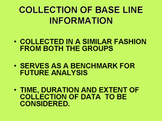 vulnerability to the disease or expected outcome This base-line information serves as a benchmark for future analysis and other considerations. Sources of information vary according to the availability and feasibility. They may be records and registers, medical examinations and investigations, interviews and environmental influence or contributions. Time, duration and extent of collection of data not only determine the design of cohort study but also influence the validity of the study. |