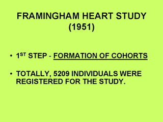 Conducted at Framingham town, Messachusets, to find out the association between the coronary artery disease and the risk factors like high serum cholesterol, hypertension, smoking etc. Framingham town was selected as it is compact, economically stable, more cooperative and represents U.S. population to a larger extent (though sample is only 68%) In 1948, a Cardiovascular demonstration programme was carried out in Framingham town. Later, in the year 1951, it was converted into a cohort study. The volunteers who have attended for initial demonstration programme were also included in the study. |