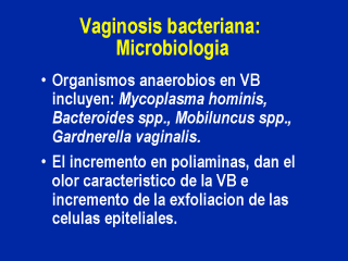 normal, Mobilucus spp son raramente vistos en la vagina normal. Sin embargo, Gardnerella vaginalis ha sido reportada del 16-42% de mujeres sin datos clinicos de VB. Algunas condiciones ambientales ocurren como consecuencia del sobrecrecimiento anaerobico incluyendo un reducido numero de poliaminas, responsables del olor caracteristico de VB y la exfoliacion epitelial celular o descarga vaginal. No se ha encontrado respuesta inflamatoria vaginal asi la terminologia de vaginosis bacteriana vs vaginitis. Sin embargo,una reciente investigacion ha reportado una disminucion del inhibidor de la proteasa leucocitaria en secrecion vaginal y un incremento en la degradacion de IgA vaginal que puede representar el mecanismo responsable para el incremento de la susceptibilidad a VIH entre mujeres con VB. |