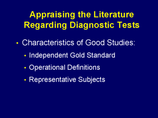 several characteristics: A gold standard to define the condition is needed. This may be a diagnostic test, however if a PT diagnosis is to lead to treatment, a treatment outcome may be the best gold standard. The test must be defined well and applied consistently. Good definitions of a positive test and a negative test must be specified. The subjects in the study should be similar to those encountered in practice. All subjects should receive both the test and the gold standard. |