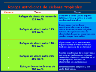 categoria 1 a una 5. La categoria no se refiere a la marea de tormenta; si una marea de tormenta es esperada saera mencionada separadamente en la alerta contra el ciclon. |