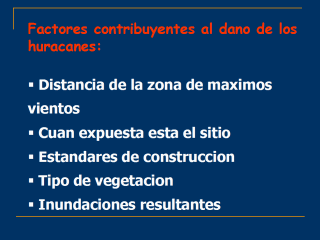 | Las categorias de la intensidad de los huracanes se refiere a la severidad en la zona de maximos vientos y por lo tanto, los efectos que se sienten en diferentes sitios puede no ser exactamente las descritas en las dos diapositivas previas y el dano variara de sitio a sitio, dependiendo de los factores senalados en esta diapositiva. |