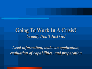 | Following a disaster or an evolving humanitarian crisis, the first response of potential field volunteers is to just want to go, not realizing that this is usually not possible, unless they have been suitably screened, prepared and training on a standby basis. In fact, following many disasters and humanitarian crises, extraneous volunteers can simply get in the way or simply add to the problem. |