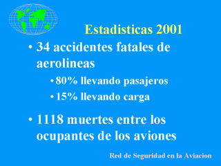 | En la base de datos de la Red de Seguridad en la Aviacion, 34 accidentes fatales en el mundo fueron selados en el 2001. Esos eventos resultaron en 1118 muertes. Ambos datos estan abajo del promedio de 1451 muertes por ano entre 1971 y 2000, y el promedio de 50 accidentes fatales por ano en el mismo periodo de tiempo. |