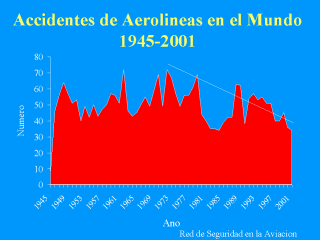 Los 34 accidentes fatales en el 2001 representan uno de los totales mas bajos registrados en la aviacion comercial moderna. El numero de accidentes, registrados por ano, es ilustrado en esta figura. La frecuencia de accidentes ha ido decdlinando desde el inicio de los 70’s.